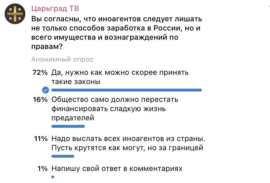 Аудитория Царьграда выступает за лишение иноагентов возможности зарабатывать в России. Фото: скриншот t.me/tsargradtv