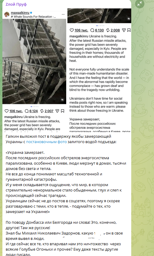 То, что враг развязал энергетическую войну первым, Галкина* не волнует. Как и то, что ВСУ обстреливают приграничные регионы России (особенно достаётся Белгородской области), устраивая там блэкаут. Ещё недавно Зеленский хвастался, что оставит без света Москву. Когда же без света остался совсем другой город – Киев, на Украине заголосили про злых русских. А Галкин* и подобные ему поспешили влиться в этот нестройный хор.