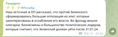 Украинский инсайдерский телеграм-канал "Резидент" со ссылкой на свой источник в офисе президента Украины сообщил, что "против Зеленского сформировалась большая оппозиция из элит, которые заинтересованы в ослаблении его власти". Судя по инсайду, у Зеленского во власти осталась всего неделя: