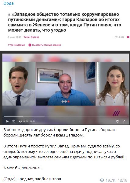 Telegram-канал "Орда" пошутил, что Путин купил Запад с большой скидкой, поскольку ему хватило денег на то, чтобы распорядиться о выплатах по 10 тысяч рублей для семей с детьми.