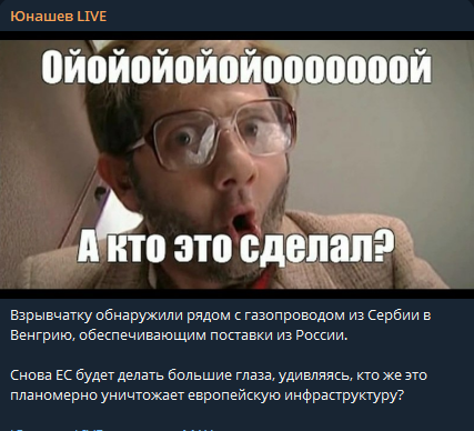 Взрывчатку обнаружили рядом с газопроводом из Сербии в Венгрию, обеспечивающим поставки из России. Снова ЕС будет делать большие глаза, удивляясь, кто же это планомерно уничтожает европейскую инфраструктуру?