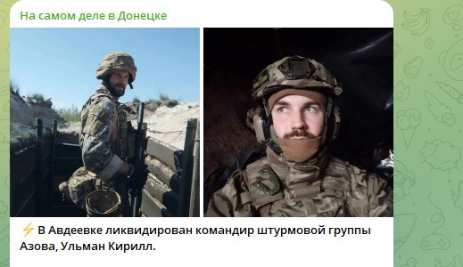 По данным aif.ru, во время освобождения Авдеевки русские военнослужащие ликвидировали командира штурмовой группы нацбатальона "Азов"* Кирилла Ульмана с позывным "Немец". В отличие от других командиров, он не успел сбежать из котла. Информацию о его смерти подтвердила его жена Дарья Ульман на своей странице в соцсети. По её словам, он не успел выбежать из Авдеевки.