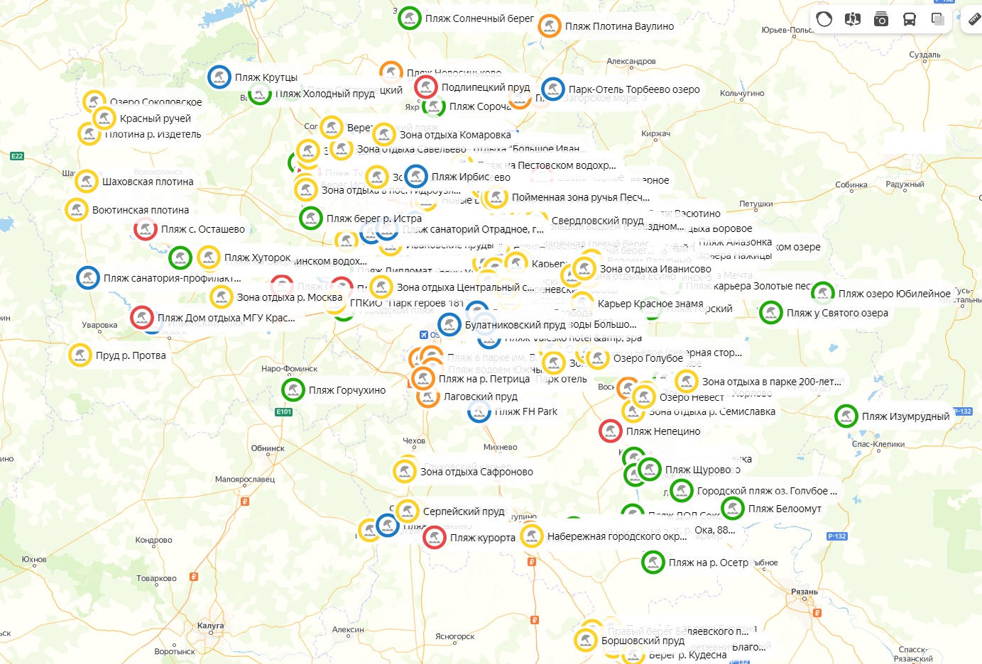 Интерактивную карту мест отдыха для жителей и гостей Подмосковья опубликовало издание РИАМО. На неё нанесены как муниципальные, так и частные пляжи. В легенде карты приняты условные обозначения: