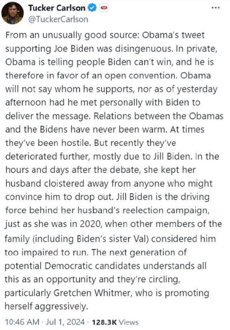Ранее журналист Такер Карлсон рассказал, что экс-президент США Барак Обама лукавит, публично заявляя о поддержке Джо Байдена. На самом деле он выступает за выбор другого кандидата на съезде партии. Информация, по его словам, получена "из очень солидного источника".