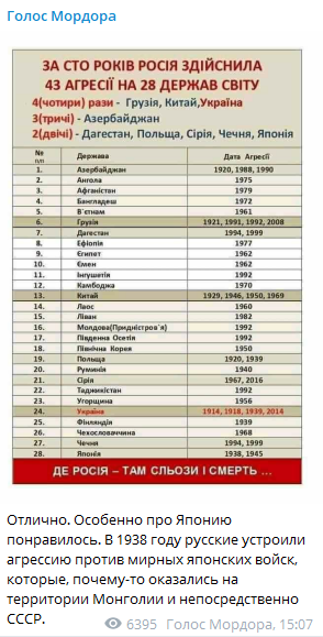 Отлично. Особенно про Японию понравилось. В 1938 году русские устроили агрессию против мирных японских войск, которые почему-то оказались на территории Монголии и непосредственно СССР, - пишет Telegram-канал "Голос Мордора".