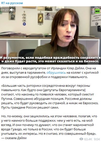 Телеканал RT связался с Клэр Дэйли и попросил её прокомментировать ситуацию, сложившуюся в Европарламенте. Евродепутат отметила, что большинство её коллег видят в Навальном человека, который может сместить президента России Владимира Путина, и хотят превратить его в "русского Гуайдо". Между тем, считает представительница Ирландии, лидера России должны выбирать граждане этой страны, а не Евросоюз.