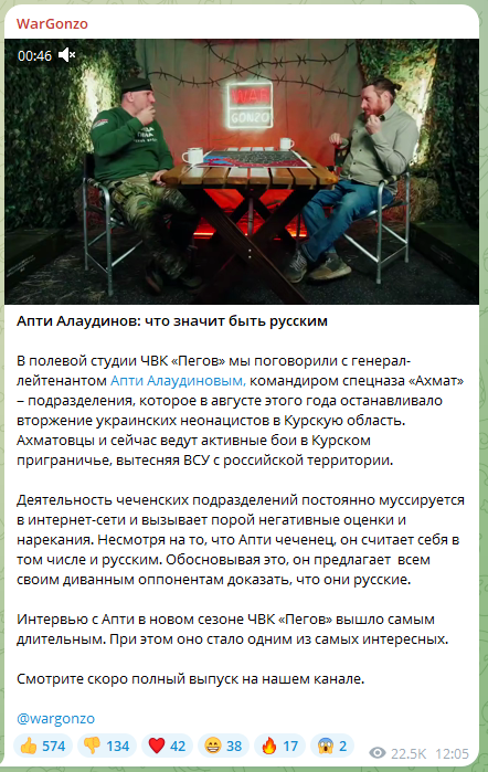 Фрагмент этого разговора опубликовал в своём телеграм-канале WarGonzo военкор Семён Пегов. Он записал разговор с Алаудиновым прямо в полевой студии. На запись генерал пришёл в толстовке с крупной надписью "Команда Путина" на груди.