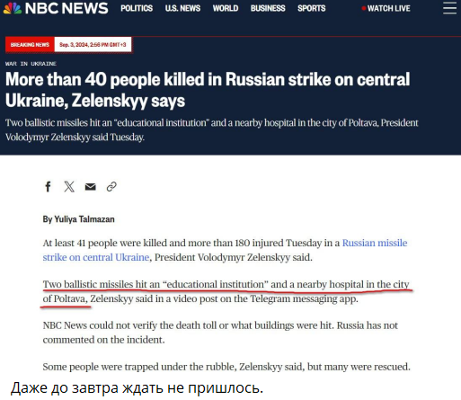 Американский телеканал NBC News сообщил, что "две баллистические ракеты поразили "образовательное учреждение" и расположенную рядом больницу в Полтаве, городе, расположенном в 190 милях от Киева".
