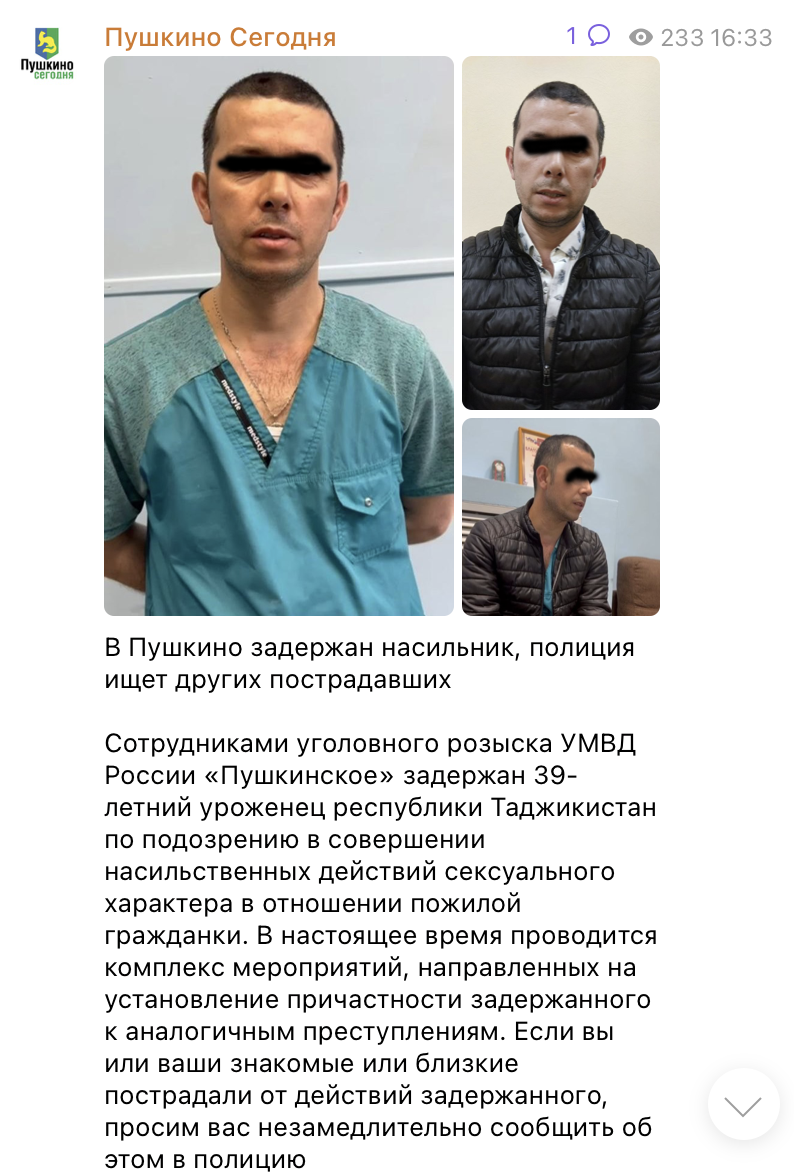 Подобные случаи имеют массовый характер по всему Подмосковью. Летом прошлого года в Раменском 60-летний нелегал совершил насилие над 11-летней девочкой в подвале дома. Также в Воскресенске гражданин Узбекистана изнасиловал школьницу. Ограбление, изнасилование и попытка убийства 82-летней жительницы Фрязино, совершённые 27-летним иностранцем, вызвали широкий резонанс.