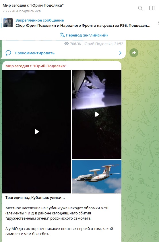 Под вечер пришла плохая новость. Над Азовским морем был сбит самолёт ДРЛО А-50, машина упала на территории Краснодарского края. С очень большой долей вероятности это снова френдли-файр. Проблема с взаимодействием авиации ВКС и частей ПВО, очевидно, является системной, что приводит к достаточно частой утрате человеческих жизней и дорогостоящей и трудновосполнимой материальной части. Напомню, что за последний месяц от своего огня были потеряны два самолёта на территории ДНР. Мир праху погибших.