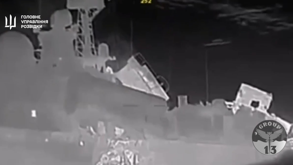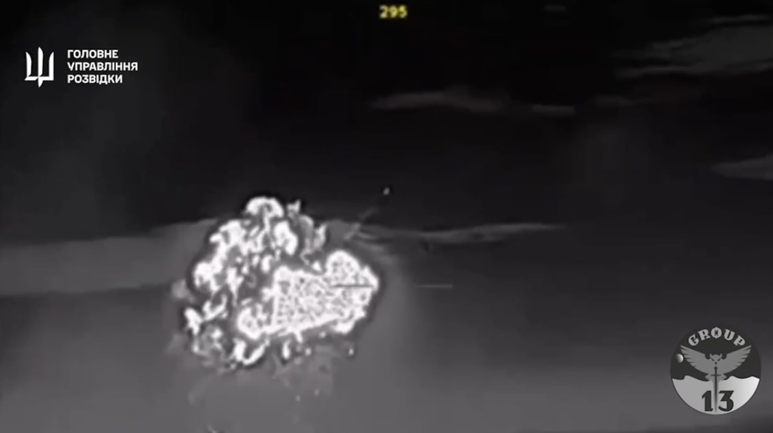 Один из последних кадров с камеры беспилотника. Говорят, что это запечатлён взрыв на борту. Не можем ни утверждать, ни опровергнуть в отсутствие официальных комментариев. Скриншот/ГУР.