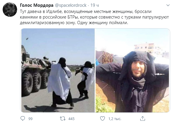 Тут давеча в Идлибе возмущённые местные женщины бросали камнями в российские БТР, которые совместно с турками патрулируют демилитаризованную зону. Одну женщину поймали, - пишет Telegram-канал "Голос Мордора".