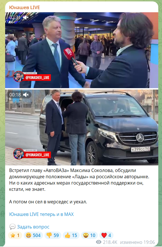 Сразу после завершения интервью Соколов сел в автомобиль Mercedes и уехал. Этот момент также попал в кадр и вызвал активное обсуждение в соцсетях и СМИ. Сам журналист Юнашев в своём канале обратил внимание на контраст между заявлениями о лидерстве Lada и личным выбором транспорта. На сегодняшний день "АвтоВАЗ" продолжает удерживать наибольшую долю рынка среди всех автопроизводителей, работающих в России.