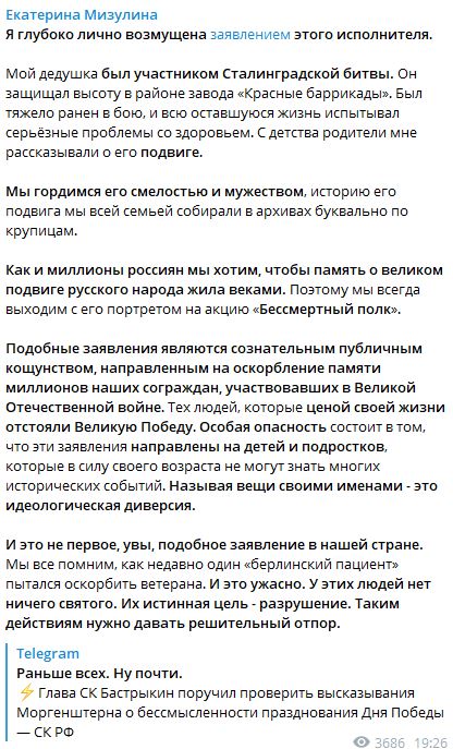 Мизулина отметила, что глубоко возмущена высказыванием Моргенштерна, который в интервью Ксении Собчак заявил, что не понимает смысла празднования Дня Победы и считает это пустой тратой денег.