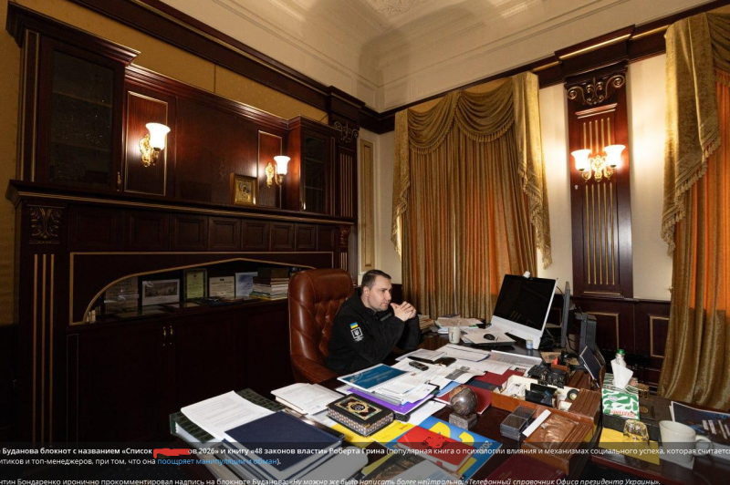 В украинском сегменте Телеграмма появились фотографии из кабинета главы офиса Зеленского Кирилла Буданова*. Это один из главных переговорщиков Украины с Россией. Внимание привлекает коллекционное издание одной популярной американской книги, секреты из которой черпали многие звёзды Голливуда, западные политики и эстрадные исполнители.