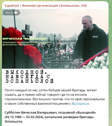 Гибель Вячеслава Субботина подтвердил официальный Telegram-канал подразделения "Эспаньола". Сообщается, что начальник разведки погиб при выполнении боевого задания с оружием в руках.