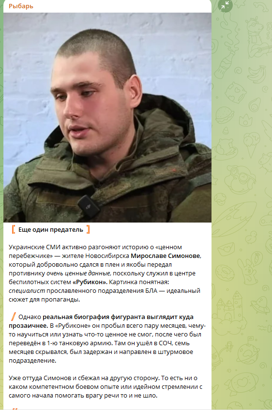 Огромный резонанс получила история с перебежчиком Мирославом Симоновым, которого украинские СМИ поспешили представить как "элитного дронщика" и носителя ценных военных секретов. В публикациях утверждалось, что он якобы служил в подразделении "Рубикон" и передал противнику важные сведения о работе российских операторов беспилотных систем.