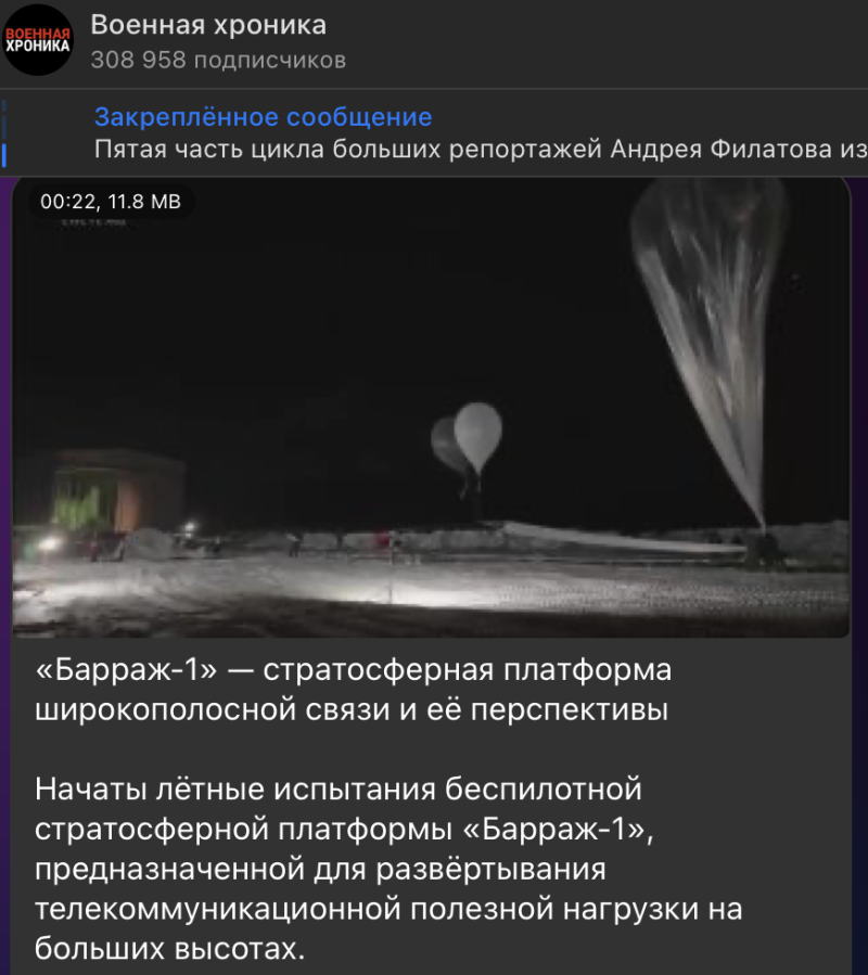 Военкор Юрий Подоляка объяснил принцип работы "Барраж-1": по сути, это дирижабль-аэростат с грузоподъёмностью до 100 кг, идеальной для аппаратуры ретрансляции 5G-связи в радиусе сотен километров. Платформа маневрирует без топлива - меняя высоту и используя атмосферные течения для удержания позиции над зоной боевых действий. Такой подход делает её недорогой и эффективной альтернативой спутникам, развёрнутой сразу после отключения Starlink.