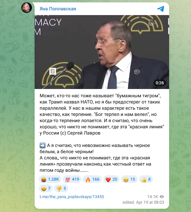 Актриса Яна Поплавская резко отреагировала на слова министра иностранных дел Сергея Лаврова о "красных линиях" России. На Анталийском дипломатическом форуме дипломат отметил, что отсутствие чёткого понимания у Запада, где именно проходят эти границы, играет на руку Москве. Лавров подчеркнул русское терпение - "Бог терпел и нам велел" - но предупредил: когда оно лопается, последствия будут серьёзными, и это даже хорошо, если оппоненты не просчитывают риски.