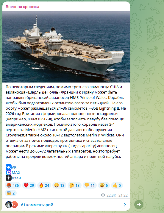 Накануне стало известно, что Франция решила отправить на Ближний Восток свой авианосец "Шарль де Голль" в составе ударной группы. Тем временем появились данные о том, что военный корабль туда отправляет и Британия. К слову, ранее Штаты решили усилить свою ударную группировку на Ближнем Востоке третьим авианосцем (по слухам, один из двух ранее отправленных туда кораблей иранцам удалось повредить).
