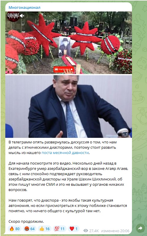Посольство Азербайджана направило в МИД России ноту протеста, а местная диаспора просто как с цепи сорвалась: её глава Шахин Шихлинский потребовал извинений от губернатора Свердловской области Евгения Куйвашева и мэра города Алексея Орлова. И... получил их. Кроме прочего, он потребовал наказать русского депутата. Что и было сделано. Выходит, азербайджанская диаспора диктует свою волю чиновникам Екатеринбурга.