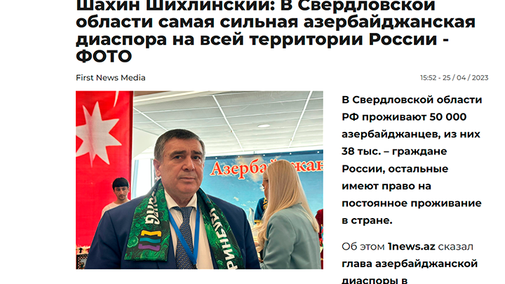 В апреле 2023 года в ходе церемонии открытия XIII Евразийского экономического форума молодёжи в Екатеринбурге Шахин Шихлинский заявил, что азербайджанская диаспора в этом городе - "самая сильная" на всей территории России. По его словам, из 50 тысяч проживающих в регионе азербайджанцев 38 тысяч являются гражданами России, остальные же "имеют право на постоянное проживание".