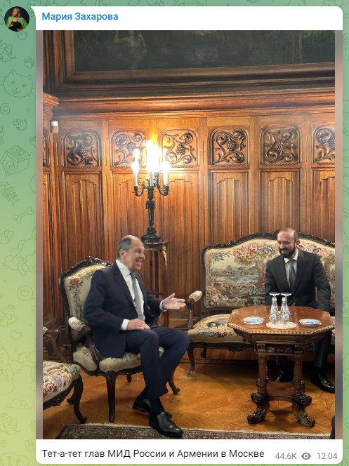 Министр иностранных дел России Сергей Лавров встретился в Москве со своим армянским коллегой Араратом Мирзояном. О переговорах красноречиво рассказала фотография, опубликованная Марией Захаровой.