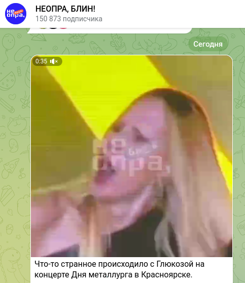 Как передаёт Mash, Глюкоза (а по паспорту Наталья Ионова-Чистякова) исчезла с афиш своего ближайшего и единственного публичного выступления в Москве. Случилось это после скандала в Красноярске, где она явно была не в адеквате: говорила заплетающимся языком, не попадала в фонограмму, да и частенько хватала себя за интимные места, выступая на сцене.