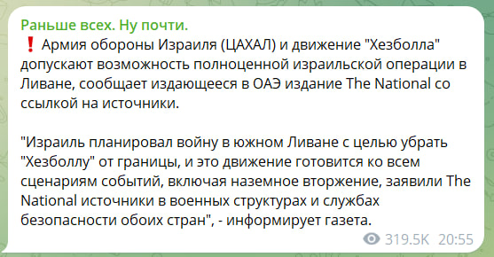 Видимо, понимая, что в войне на несколько фронтов Израиль не выстоит, тем более без постоянной финансовой поддержки США, Иерусалим публично допустил заморозку конфликта в Газе для вступления в открытую конфронтацию против Ливана. "Хезболла" в свою очередь готовится ко всем возможным сценариям войны с Израилем вплоть до начала глобальной войны на уничтожение местного колониального гегемона, окружённого со всех сторон.