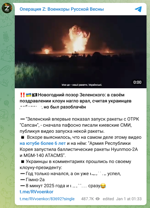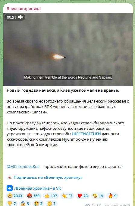 Новый год едва начался, а Киев уже поймали на вранье… Почти сразу выяснилось, что кадры стрельбы украинского "чудо-оружия" с пафосной озвучкой "це наши ракэты, украинские" - это кадры стрельбы шестилетней давности южнокорейских комплексов Hyunmoo-2A на учениях южнокорейской же армии,