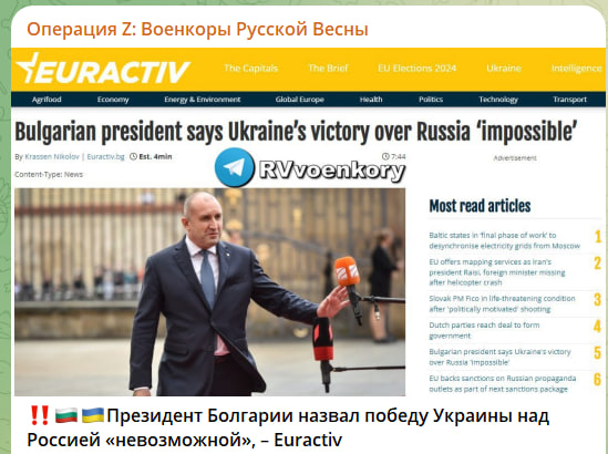 Президент Болгарии назвал победу Украины над Россией "невозможной", сообщает издание Euractiv. По его мнению, продолжать украинский конфликт нельзя, потому что это убивает Киев.