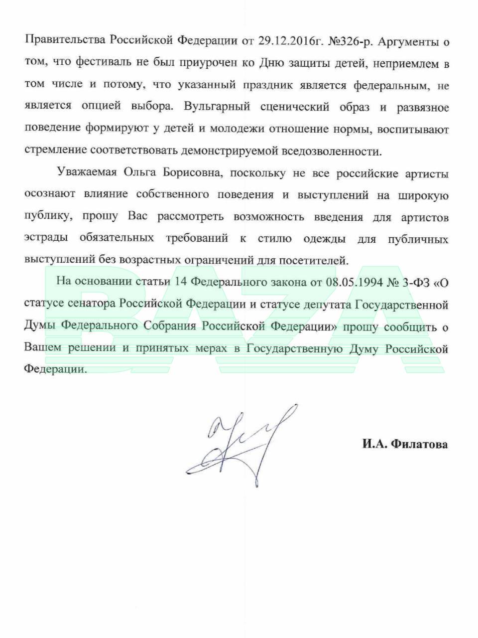После того, как жители и гости Уфы пожаловались на слишком вызывающий наряд Ольги Бузовой, депутат Ирина Филатова предложила внести обязательные требования к стилю одежды артистов во время публичных выступлений. Так "голый" скандал дошёл и до Госдумы.