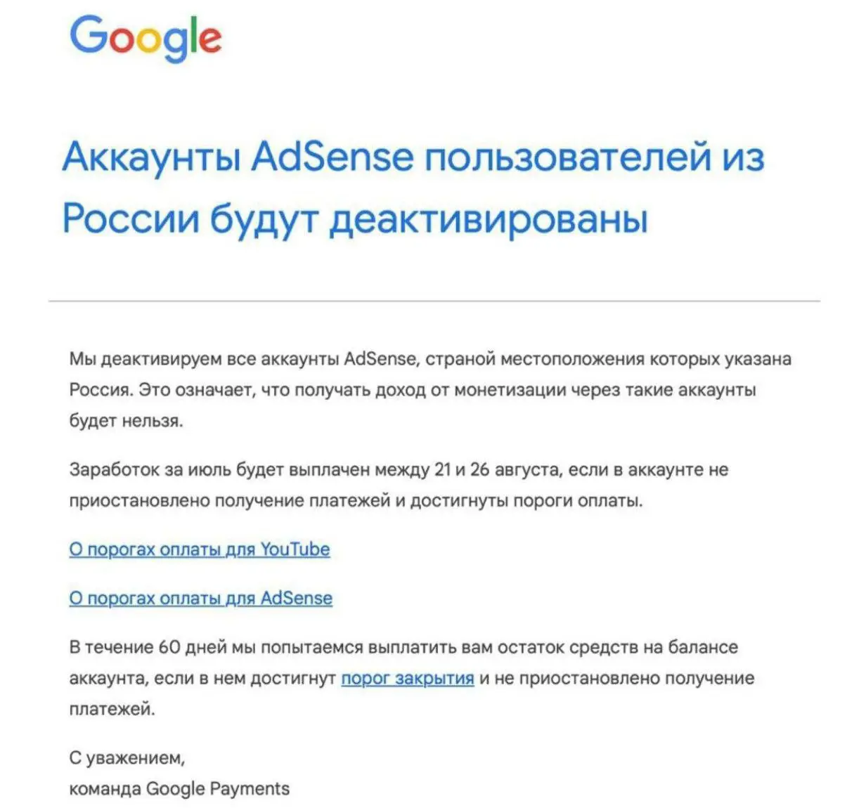 Google информирует пользователей, что отключает монетизацию для аккаунтов из России. Теперь блогеры останутся без денег - альтернатив нет.