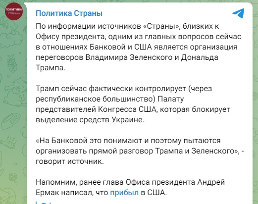 Трамп сейчас фактически контролирует (через республиканское большинство) палату представителей Конгресса США, которая блокирует выделение средств Украине. На Банковой это понимают и поэтому пытаются организовать прямой разговор Трампа и Зеленского,