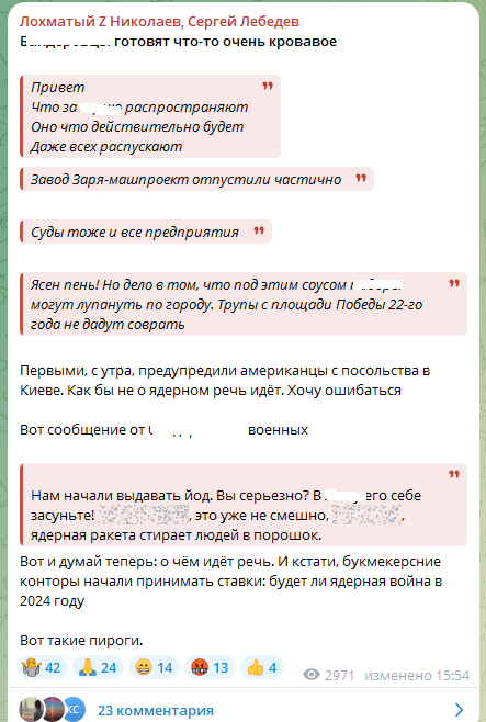 Тревожный пост появился в телеграм-канале координатора николаевского подполья Сергея Лебедева. Он информирует о том, что украинская сторона готовит "что-то очень кровавое".