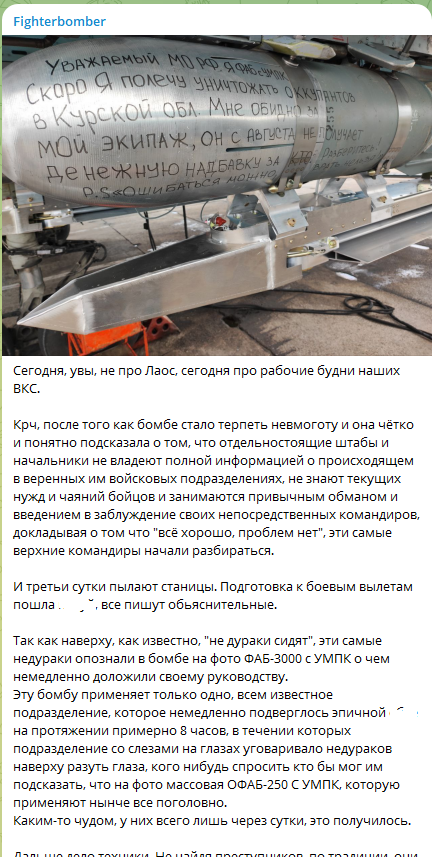В телеграм-канале военлёта Fighterbomber, который с самого начала освещал историю "говорящей бомбы", недавно появились подробности "разбора полётов". Разумеется, без этого никак не могло обойтись, поскольку обращение привлекло широкое внимание общественности.