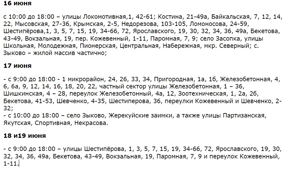 График отключения электричества в Чите с 13 по 19 июня