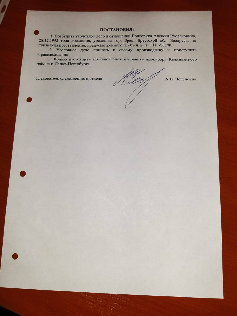 Алексей Григорик был вынужден принять постановление, составленное следователем А.В. Чепелевичем, в котором чётко указывалось, что учитель намеренно причинил тяжкий вред здоровью школьника на фоне личной неприязни.