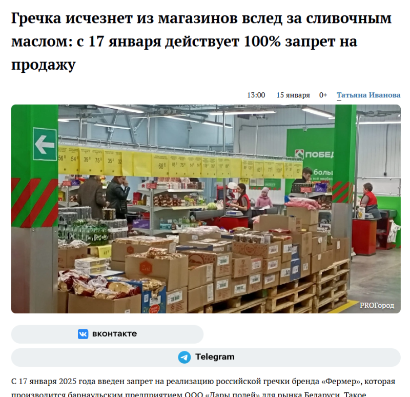В общем, открыв такой материал, становится очевидно, кто тут врёт. За скандальным заголовком следует объяснение, что гречку определённой компании из России не поставляют больше в Белоруссию.