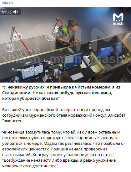 По данным Telegram-канала Mash, норвежская дипломат преподала "урок европейской толерантности" сотрудникам мурманского отеля. Женщину возмутило, что ей, как и всем остальным посетителям, необходимо подождать, пока горничные закончат прибираться в номерах. С использованием нецензурной лексики она стала кричать, что "ненавидит русских", а русские женщины, по её словам, "убираются абы как" и вообще, мол, у неё на родине чистота в номерах, а в России ужас.