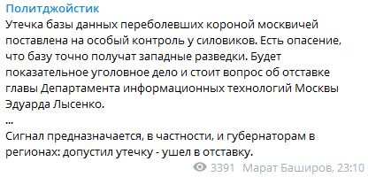 Баширов полагает, что слитую базу данных могут получить представители иностранной разведки. Он не исключил, что правоохранительные органы возбудят "показательное уголовное дело", а глава Департамента информационных технологий Москвы Эдуард Лысенко лишится своей должности. Но главное, что это станет сигналом для всех регионов.