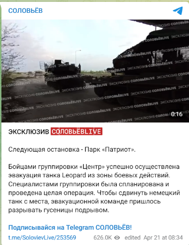 Эвакуацию трофейного танка Leopard 2 сняли на видео. Кадры публикует "Соловьев Live". Также сообщается, что для транспортировки гусеницы танка пришлось разрывать.