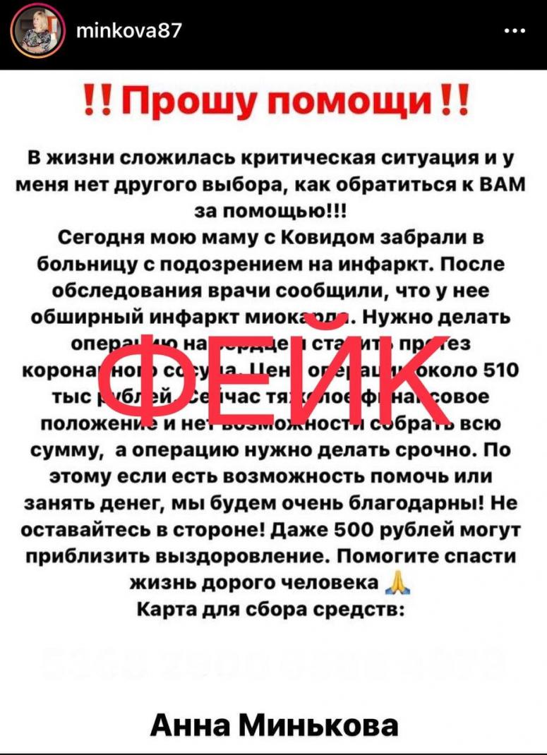 Неизвестные опубликовали пост в аккаунте от лица замглавы региона. Они написали сообщение с просьбой о помощи. Якобы маму чиновницы забрали в больницу с подозрением на инфаркт, сейчас ей требуется операция, на которую нужны деньги. Далее мошенники оставили номер банковской карты, на которую попросили перечислять средства.