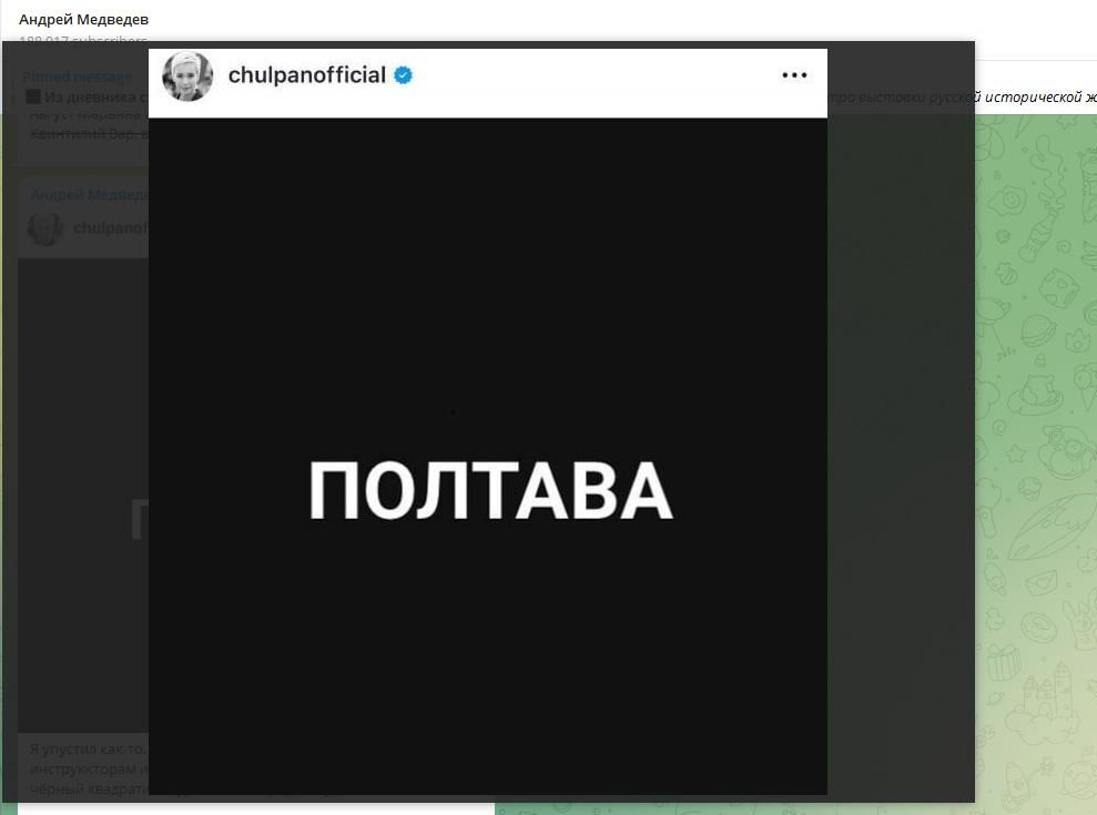 Во вторник, 3 сентября 2024 года, народная артистка России Чулпан Хаматова разместила в своих соцсетях пост с одним лишь словом на чёрном фоне - "Полтава". Суть высказывания понятна: сбежавшая в 2022 году в Прибалтику либеральная "звезда" выражает своё сочувствие и демонстрирует скорбь после нанесённого ВКС России удара по военному объекту в Полтаве. Хаматова скорбит по погибшим украинским военным, которые должны были в ближайшее время обеспечивать связь вторгшимся в Курскую область захватчикам и наносить удары боевыми БПЛА по русским городам и сёлам.