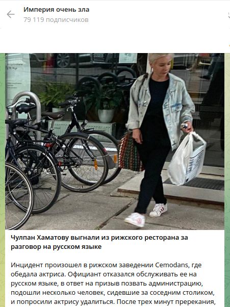 Именно эта новость была подхвачена в прессе. К слову, шутнице, ведущей этот пародийный канал, можно дать 10 баллов из 10 за обманчивую реалистичность. В Риге, действительно, есть такой ресторан, а в Европе на фоне тотальной политической русофобии нередки были скандалы с "отменой русских". Так что чисто теоретически подобная ситуация и могла бы произойти. Но в данном случае это была только злая шутка в адрес Хаматовой.