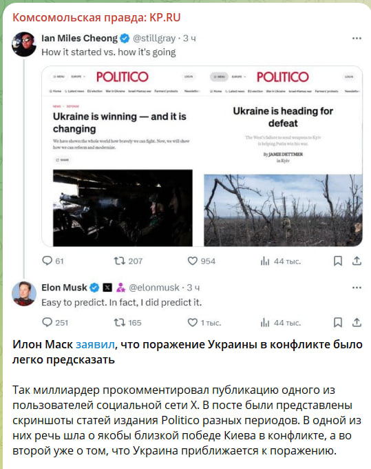 О ситуации с грядущим поражением высказался даже миллиардер Илон Маск, прокомментировав материал Деттмера, он заявил, что поражение Украины в конфликте было легко предсказать. Глава SpaceX напомнил, что ранее он предсказывал, что Украина неизбежно потерпит поражение в конфликте.
