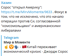 Хазин обратил внимание на недавнее выступление американского финансиста Джорджа Сороса в Институте Гувера. Там он заявил, что Китай столкнулся с резким падением цен на недвижимость, которая всегда была главным средством инвестирования. Это, как полагает Сорос, спровоцировало рост недоверия людей к лидеру страны Си Цзиньпину.