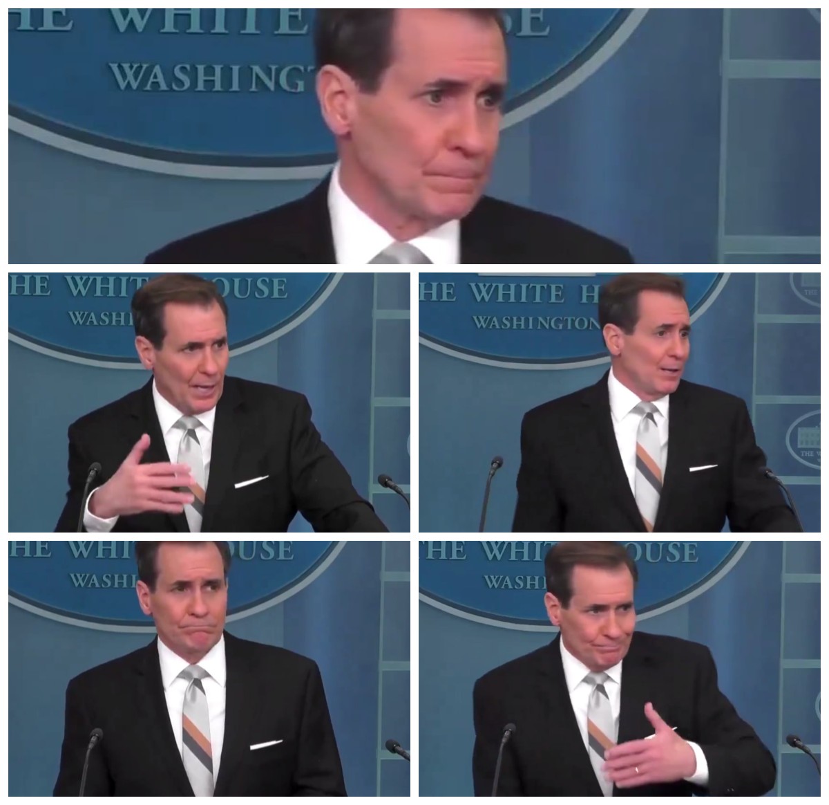 Джон Кирби, координатор Белого дома, выступил с заявлением, что нельзя доверять ни Путину, ни Карлсону. Однако его мимика отражала переживание различных этапов восприятия сложной информации: отрицание, гнев, торг, депрессия и, наконец, принятие.