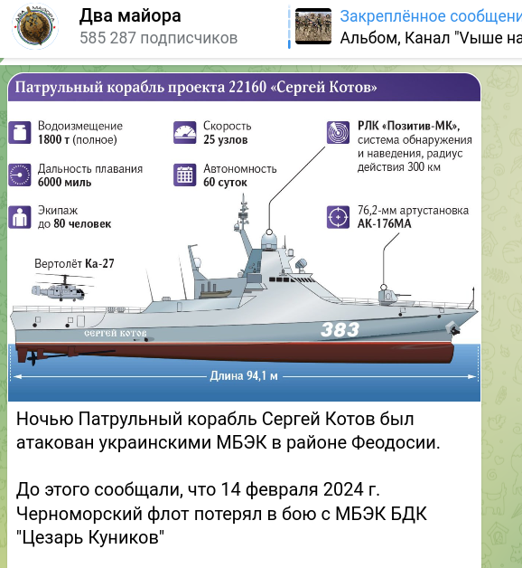 Все знали, оставалось только ждать, - отметил инсайдер. - Так и случилось: БЭКами был атакован патрульный корабль проекта 22160 "Сергей Котов". Пока уточняю по судьбе экипажа, но судно - всё.