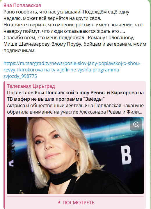 После предыдущей статьи Царьграда о невыходе в эфир шоу Реввы и Киркорова Поплавская заявила, что пока рано радоваться.
